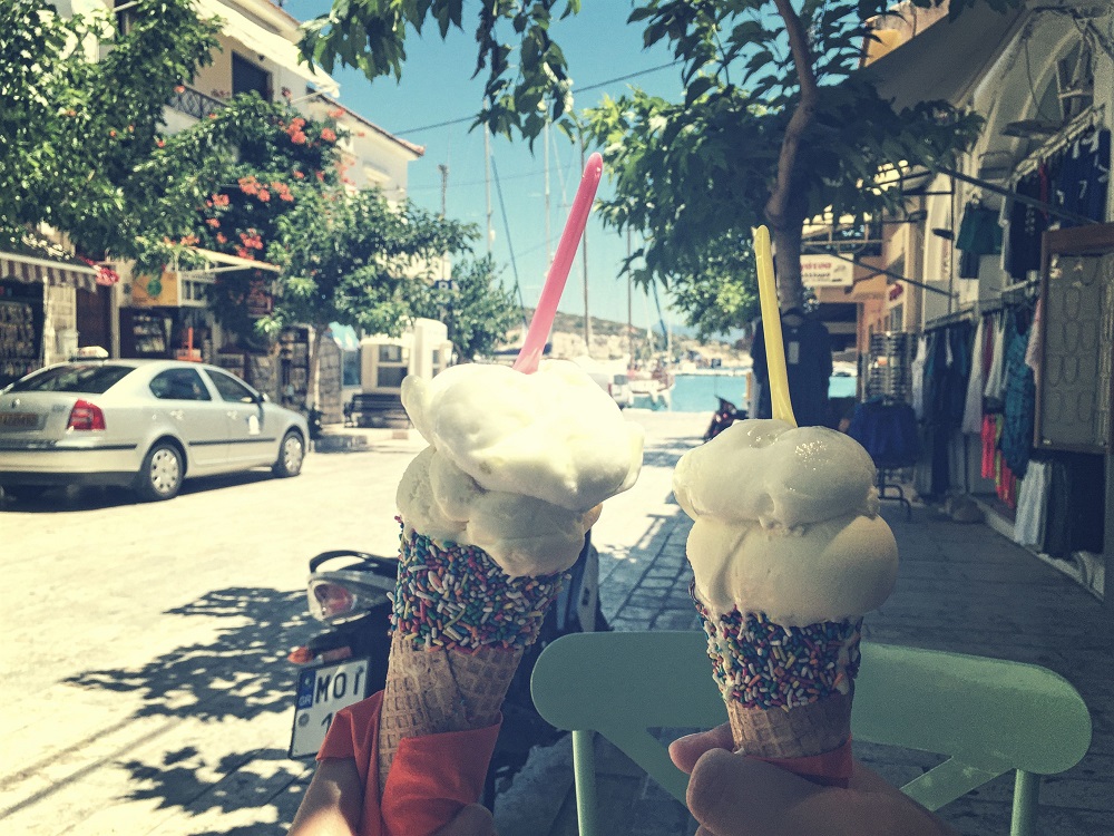 Samos’a gidiyorsanız zaten Pisagor’a uğramadan olmaz. Orange’ı kesinlikle denemelisiniz. Adanın en iyi dondurmacılarından biri diyebilirim. Farklı külah seçeneği ve çeşitli dondurmalarıyla Pisagor sokaklarında yürüyüş yaparken dondurmanın keyfini çıkarabilirsiniz. Fiyat olarak fotoğrafta gördüğünüz gibi 2 kişi/4top için 5 euro ödedik.